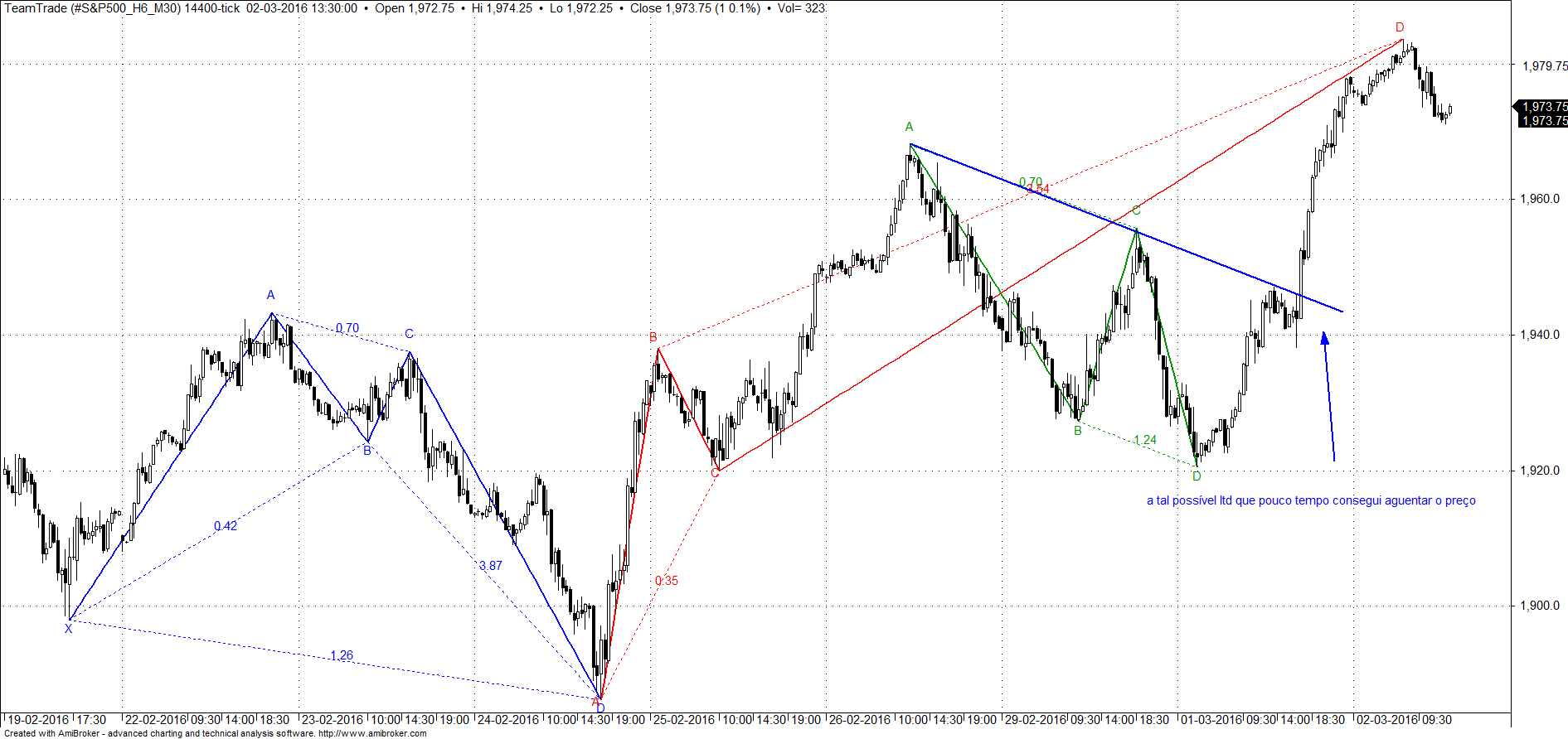 Estou a achar muito interessantes estas ferramentas dos harmónicos, pois são bastante úteis para apanhar o desenvolvimento das figuras clássicas da AT e até para tentar prever onde elas se podem formar. Repara no caso desta possível LTD que neste momento é uma linha de 2 toques, mas pelos harmónicos tem forte probabilidade de se transformar numa LTD, basta que para isso os 78.6 funcionem como PRZ (potential zone reversal)