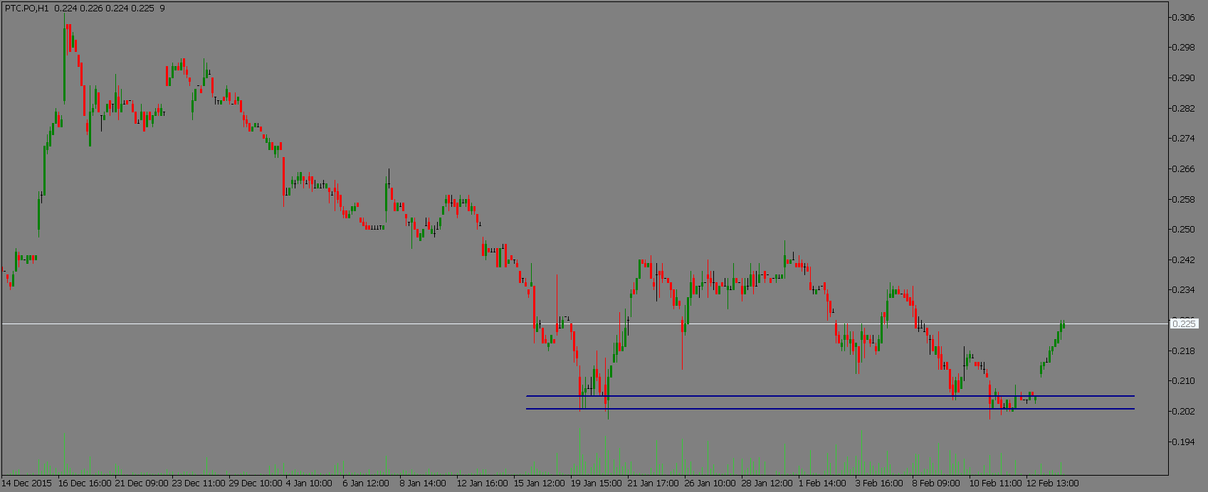 No curto prazo, olhando para o gráfico horário, existe uma importante zona de suporte que ajuda neste momento a dar fôlego a uma eventual reacção. Mas se o suporte é importante, não o é menos a resistência dos 24,2 cêntimos. Será a ultrapassagem de um ou do outro ponto que ditarão o sentido da tendência de curto prazo. Contando-se entre pontos com uma amplitude de 20%, está fácil de ver que uma quebra em alta ou em baixa poderá fazer toda a diferença. Fica, portanto, em primeiro lugar a indicação de prudência. Seja em que sentido for que optem por fazer a negociação, não descurem na colocação dos stops. E, se possível, esperem por uma definição de direccionalidade antes de optarem por um dos sentidos para o posicionamento.