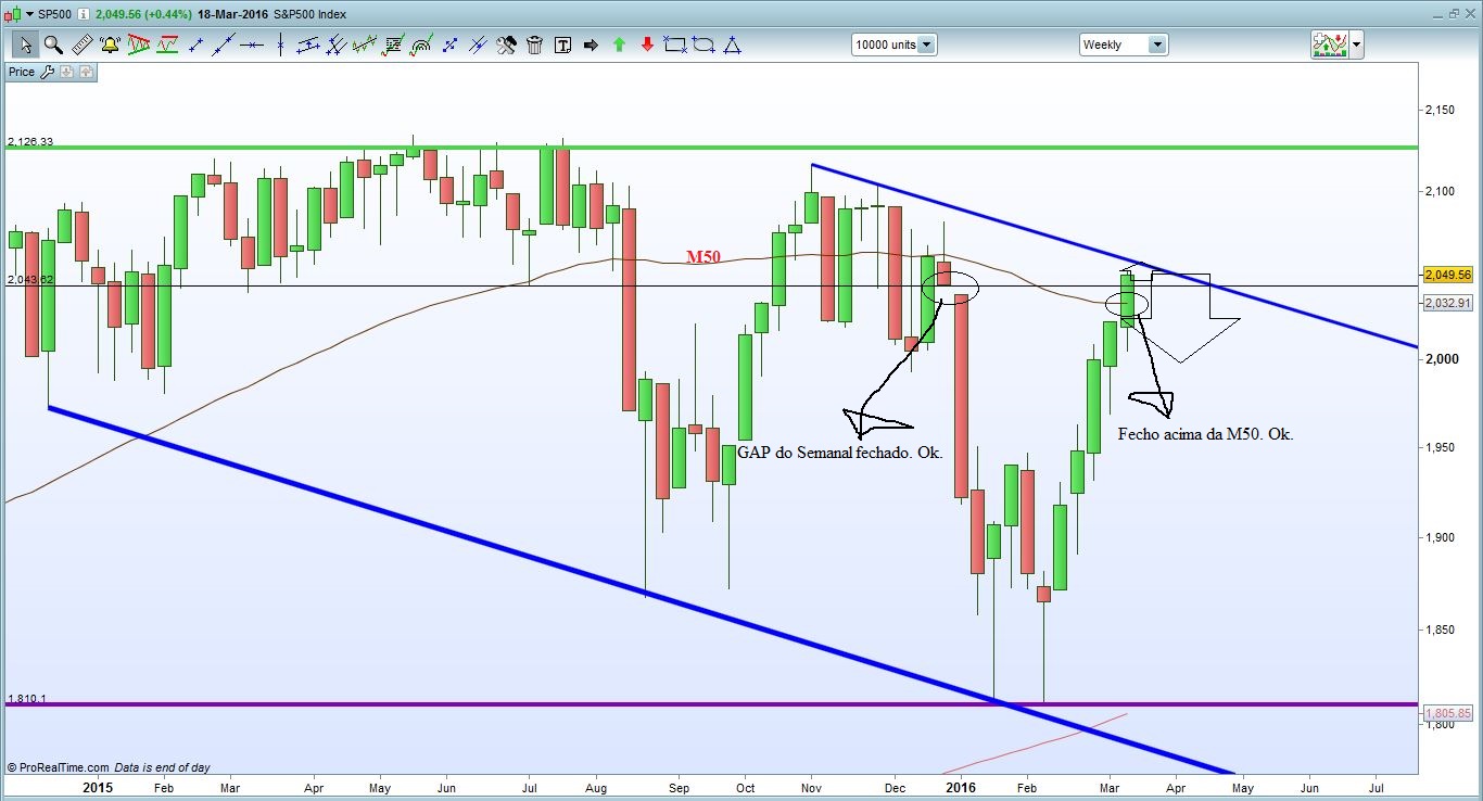 O S&P500 está a uma unhaca de fechar o GAP do semanal, mas o que me parece é que não existe nenhuma razão para que quando o fechar aconteça a tal famosa queda que tarda em acontecer. Pensando no modo Longo, que é aquele que me está a interessar para já, o dia de amanhã e de sexta são fundamentais, para além do fecho do GAP é importante que o Preço fique acima da M50 no semanal, se isso acontecer então acho que pode haver surpresas boas do lado longo.