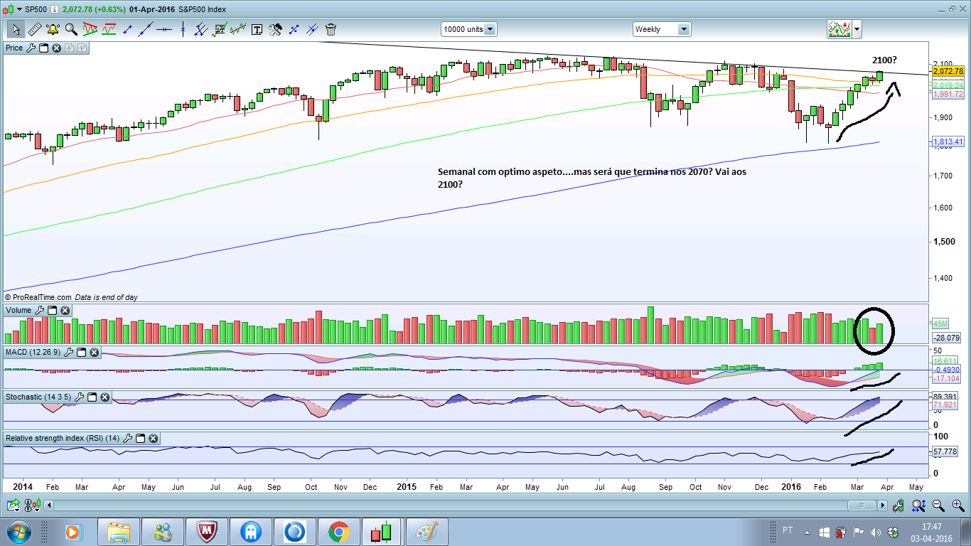 Estamos num simples Canal Ascendente, nada de especial, onde a cotação se vai desenvolvendo rumo ao muro que estará lá mais acima nos 2120/15 (por ai) e ai sim haverá muitas questões pertinentes a colocar. Quanto ao IH&S de que o estimado Primvs fala eu pessoalmente não acredito nele. Quanto à projecção que é feita lá bem alta até posso acreditar, mas não será por causa do IH&S. Aliás, estas figuras são tão abstractas e tão moldáveis à vontade de cada um que atrevo-me a dizer que do que tenho visto elas nem sequer existem... (?!?!?!?!) sim, isso, quase sempre são misturas de várias figuras, canais, ou mesmo outras figuras.