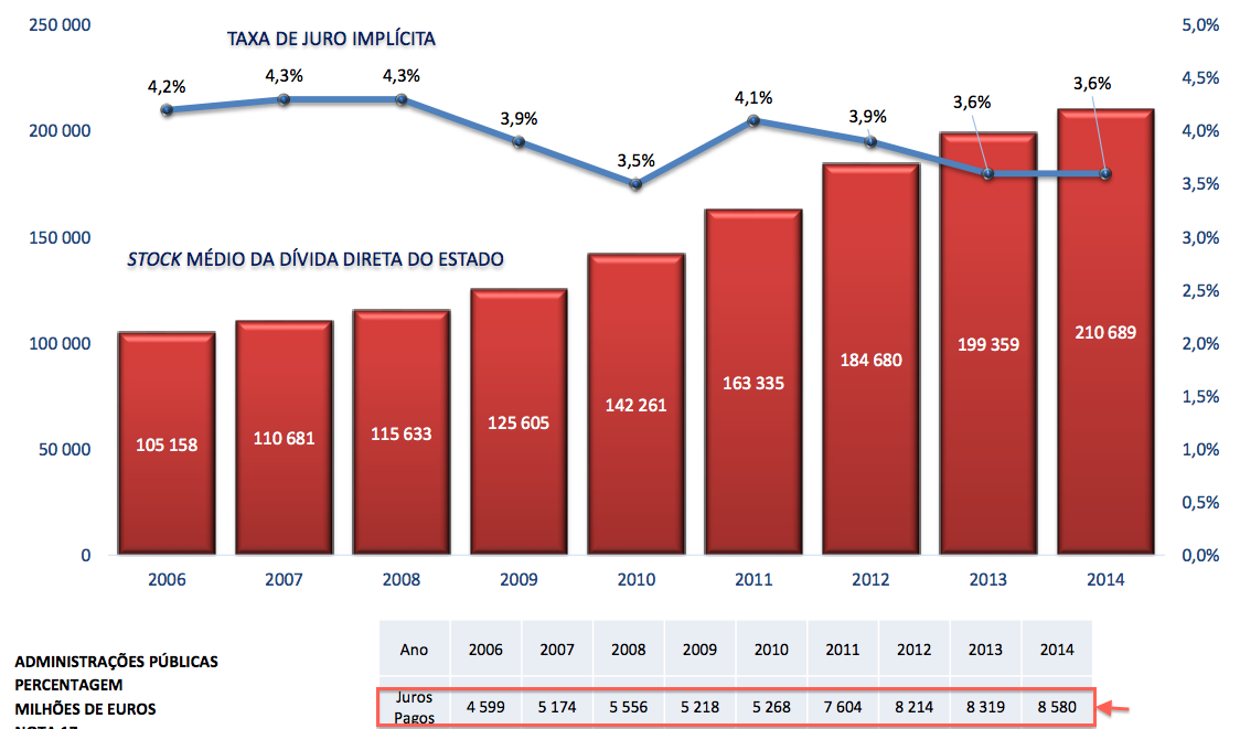 Em 2014, os encargos com a dívida corresponderam a 11% da receita obtida pelo Estado.