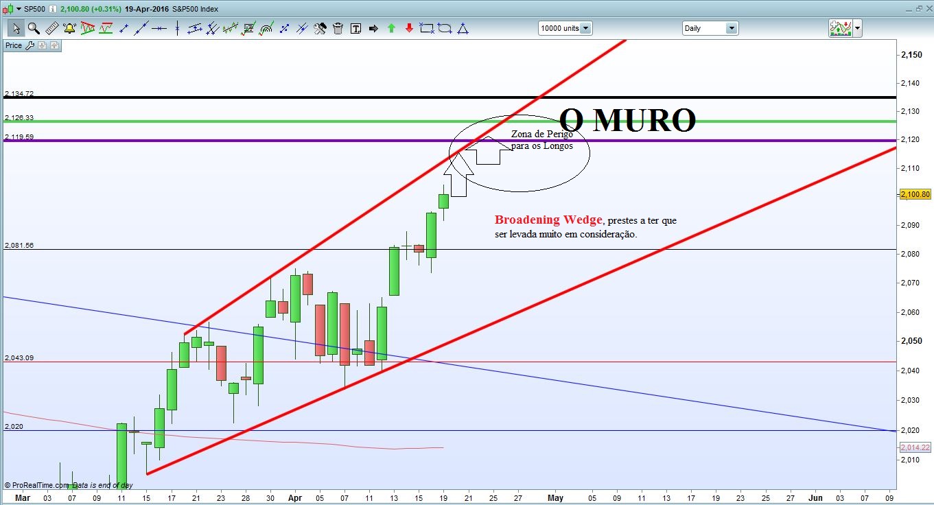O Índice mostra a sua força e aproxima-se decididamente do Muro lá de cima. Este aproximar vai aumentar o risco para o Lado Longo, é preciso prudência porque as boas velas de inversão existem e são muito rápidas. É preciso tomar muita atenção à reacção do Preço ao tocar e/ou penetrar no Muro e principalmente se o toque coincidir com a figura que se começa a perfilar. Entre o final desta semana e o inicio da próxima o Prognóstico para o lado Longo começa a ser muito reservado!!!!!