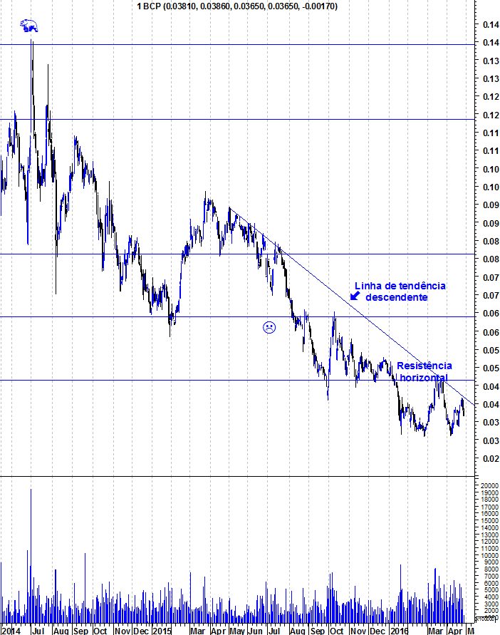 O BCP pode ficar extremamente interessante se quebrar as resistências decisivas (LT descendente e, sobretudo, resistência hotrizontal). Mas é se isso acontecer. Quem tem tentado antecipar essas inversões tem-se dado mal. Por isso, não vale a pena estar a tentar prever o que vai acontecer. Se esses sinais surgirem, serão poderosos e teremos uma inversão de médio prazo. Mas nos últimos meses, sempre que tem estado quase nunca consegue. Esperar, esperar, esperar.