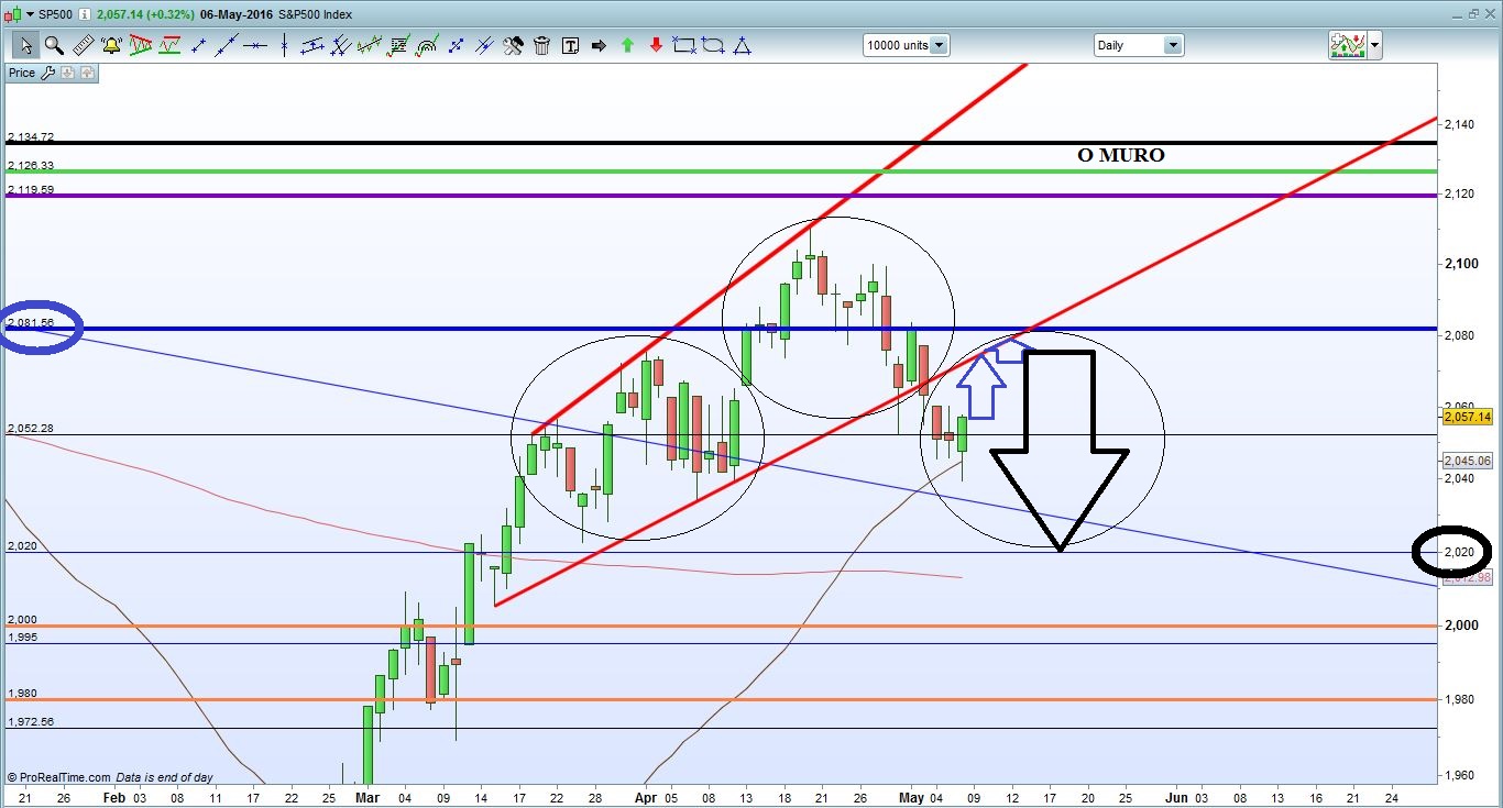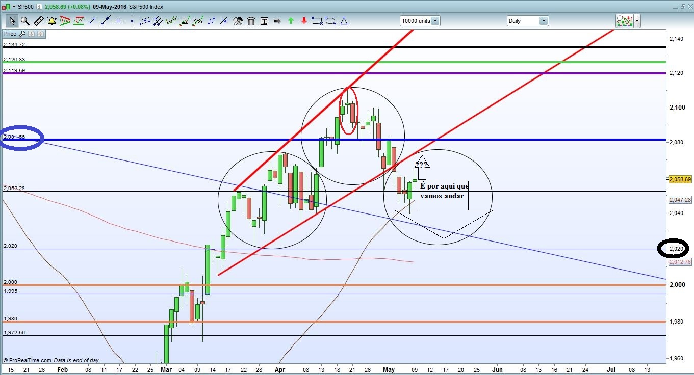 A grande resistência do momento está exactamente nos 2081,56 um anterior máximo relativo, mas que pelo Prognóstico o Preço não deverá conseguir lá chegar (isto milimétricamente falando). O que está a acontecer e que com a vela de ontem ficou claro é um teste à linha inferior da Wedge e/ou ao referido anterior máximo relativo. Com isto e para quem gosta dos H&S temos um em plena formação e num topo.