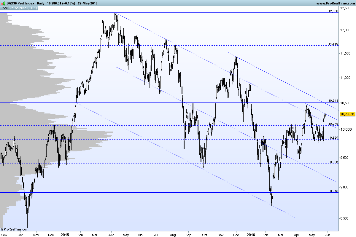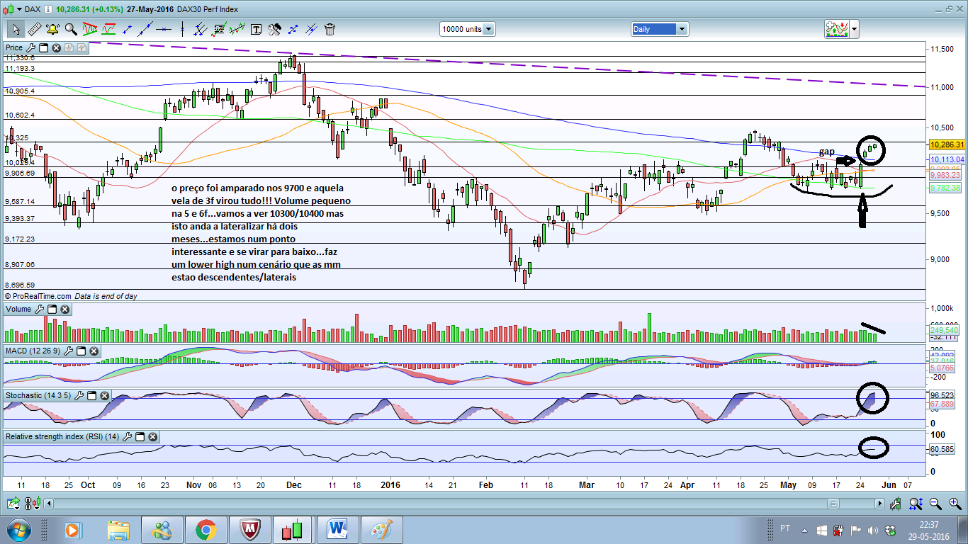 No DAX a MM200 semanal neste momento nos 10319 deverá servir de barreira a subidas superiores, tal como aconteceu em meados de Abril nas 2 semanas de forte subida .