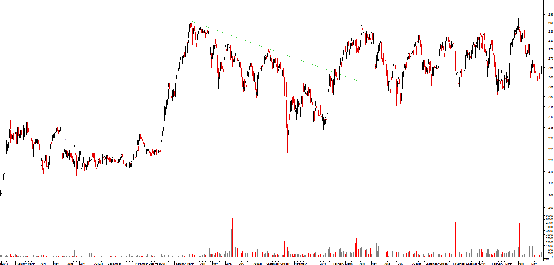 Esta ação é das mais difíceis de analisar, para mim. Não consigo identificar suportes (ou resistências) óbvios entre os que existem à volta dos 2.5€ e 2.8€.