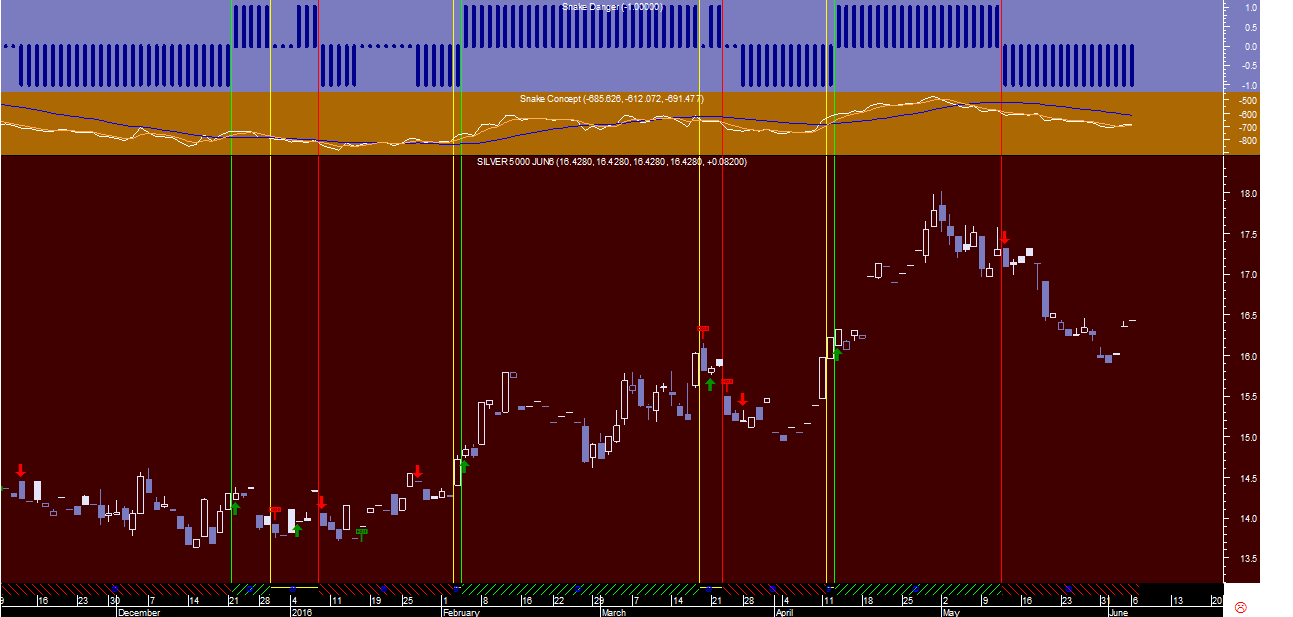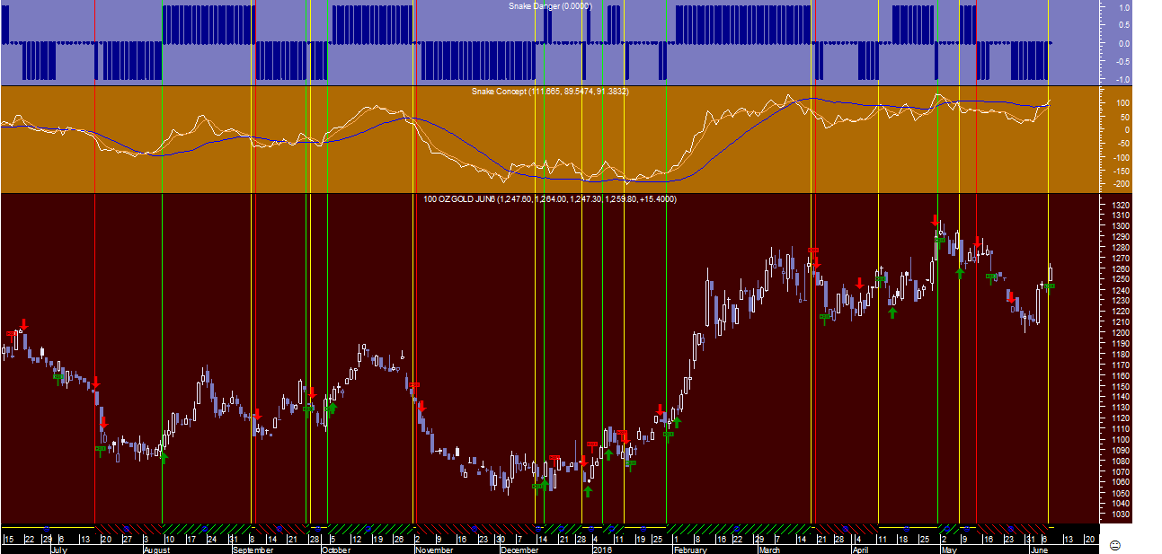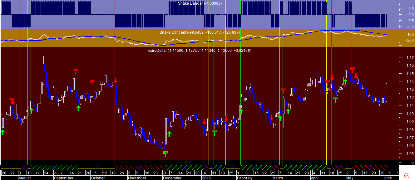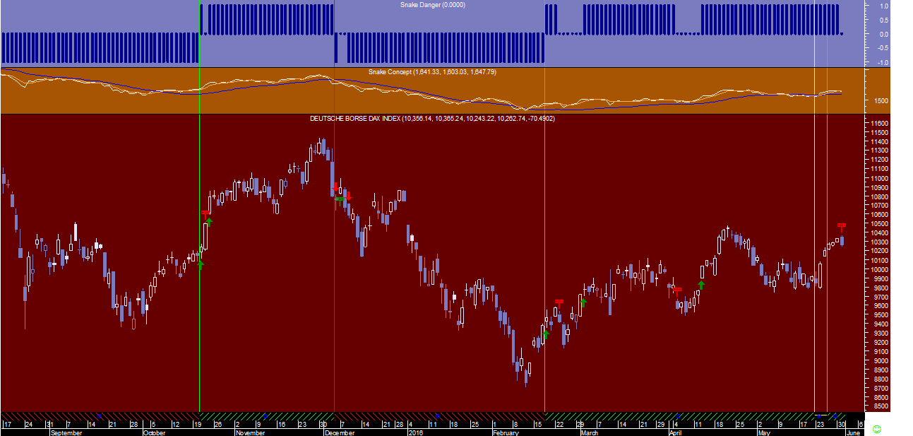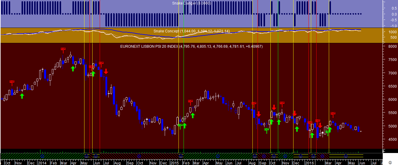 Ficam em anexo os sinais da “Cobra” no gráfico diário onde se pode detetar que, apesar do sinal continuar virado para cima, apareceu nesta semana no dia 24 de maio uma alteração de um regime tendencial ascendente para lateral, através da visualização da linha vertical amarela no gráfico.