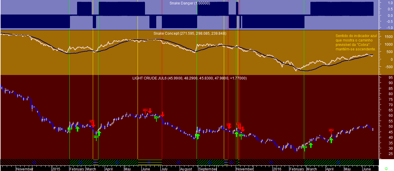 Obviamente essa tendência na escala semanal é ainda mais acentuada, uma vez que o indicador branco que representa o caminho real da "Cobra" se encontra neste caso acima do seu caminho previsível, representado pelo indicador azul.