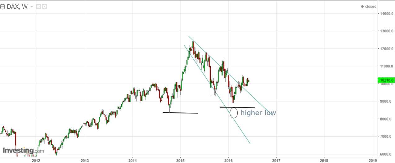 posto isto, deixo 1 gráfico semanal do dax no qual ponho a hipótese deste movimento descendente q vem desde os 12000 se tratar de uma broadening entretanto quebrada (contrapondo ao teu H&S), e onde se vê que o último mínimo já não foi à sua linha inferior (daí o hagopian marcado com circulo).