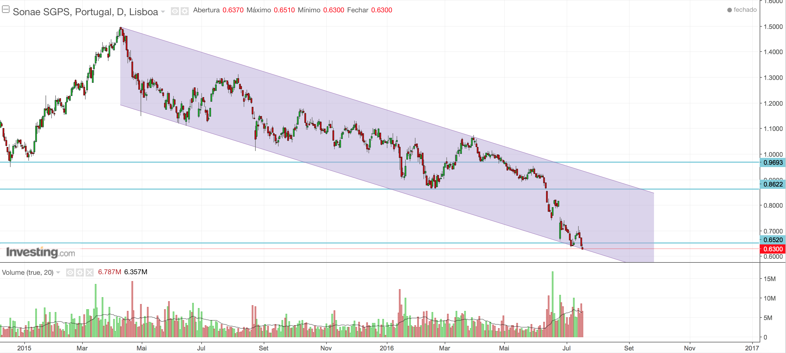 É importante que a SONAE não feche a semana abaixo dos 0,65€. É um suporte já de longa data muito importante e caso seja quebrado a acção tem margem para descer bastante, conforme gráfico semanal