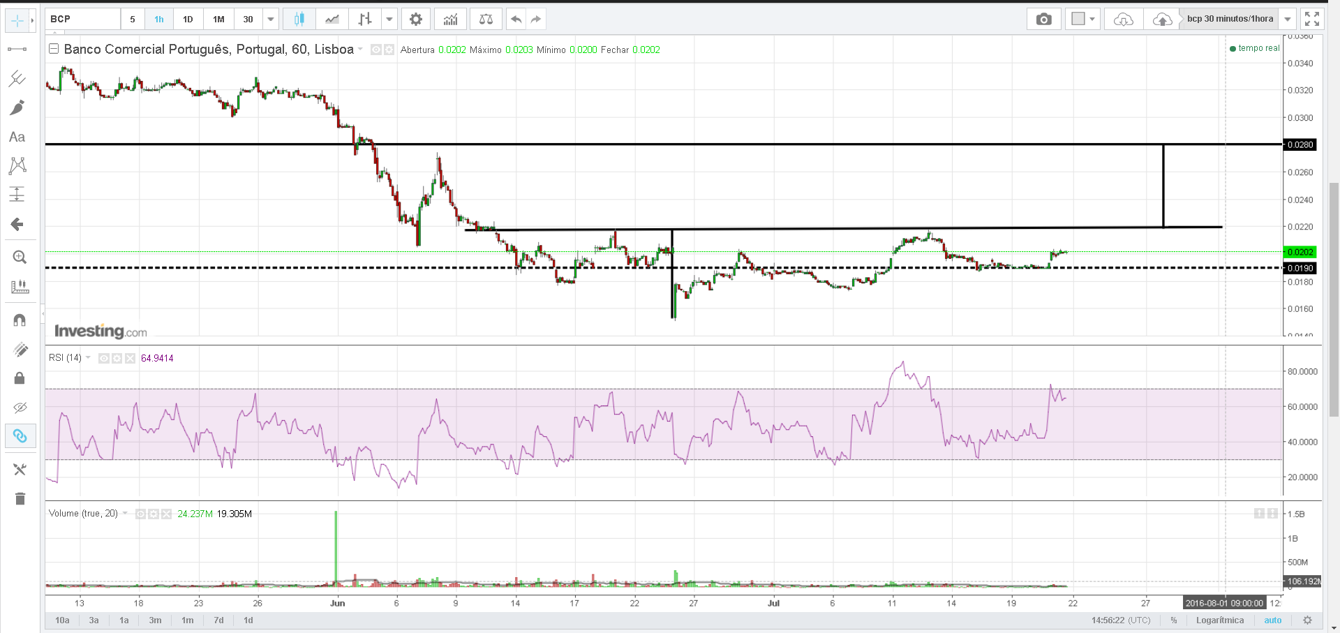 já não comentava á algum tempo existe esta possibilidade no BCP de ativar uma chavena com projecção pelos 0.0280 mas precisa de quebrar a linha a preto no gráfico no tempo de 30/1 hora verifica.se isso ...