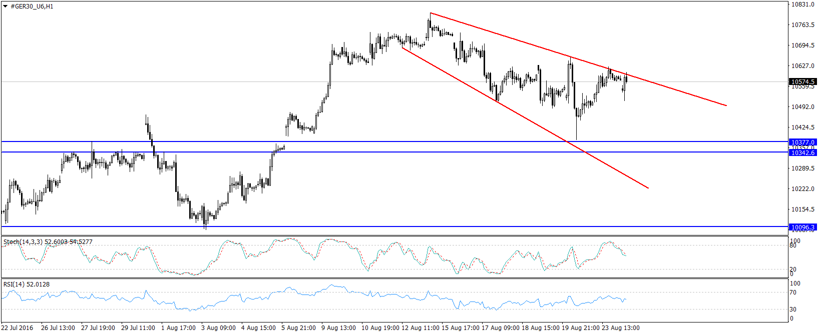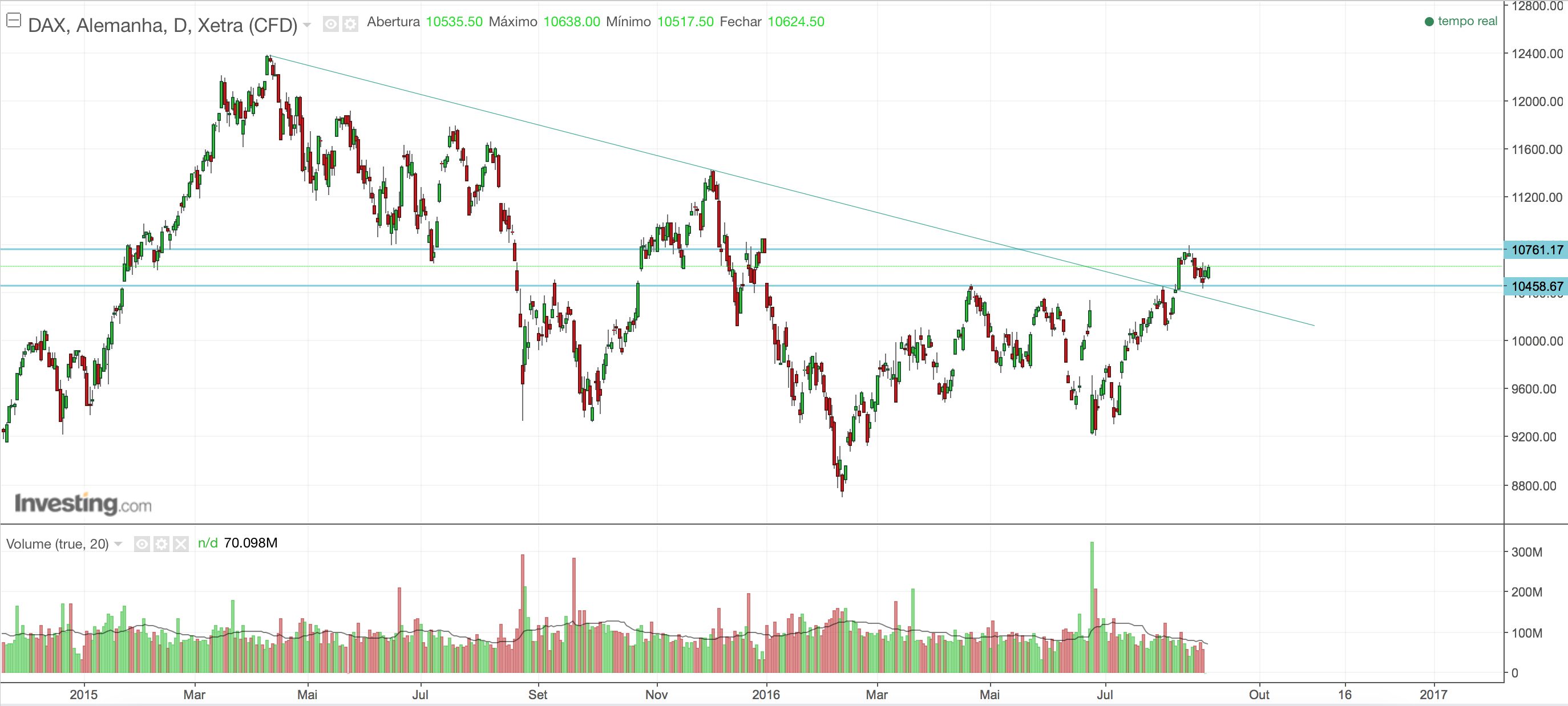 O DAX está neste momento um pouco numa zona de "nenhures". Passou a resistência dos 10450 e foi fechar o gap. Voltou a descer e aguentou na antiga zona de resistência que agora virou suporte. Portanto está ali numa zona de indecisão. No entanto, a quebra da linha de tendência descendente e da resistência dos 10450 parecem apontar o caminho para cima.