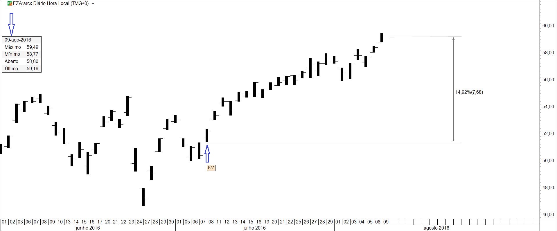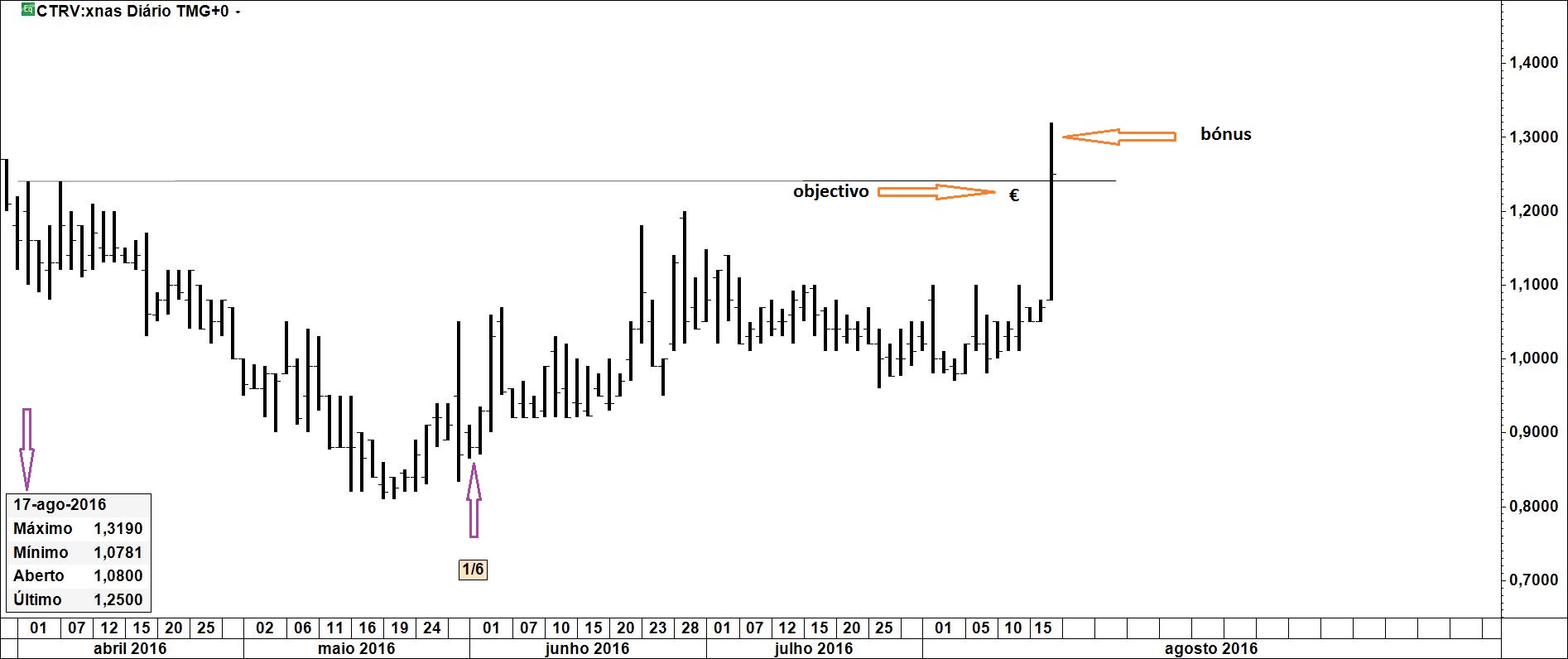 Quem teve a oportunidade de continuar o acompanhamento da ddd após o encerramento e a revelação do negócio nela executado pôde, na melhor das hipóteses, duplicar o investimento em pouco menos de 2 meses. Evidentes razões técnicas, uma das quais se apresenta no gráfico 2, teria justificado o encerramento da posição nesse momento. Presume-se que quem manteve o investimento estará satisfeito. Um prémio, portanto, para os não distraídos.
