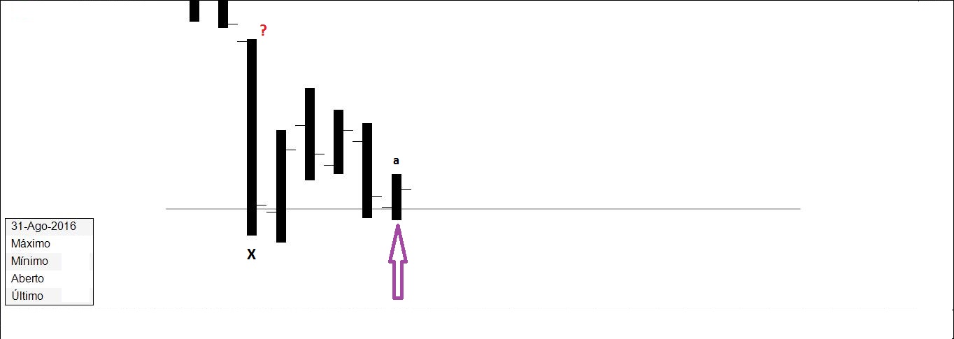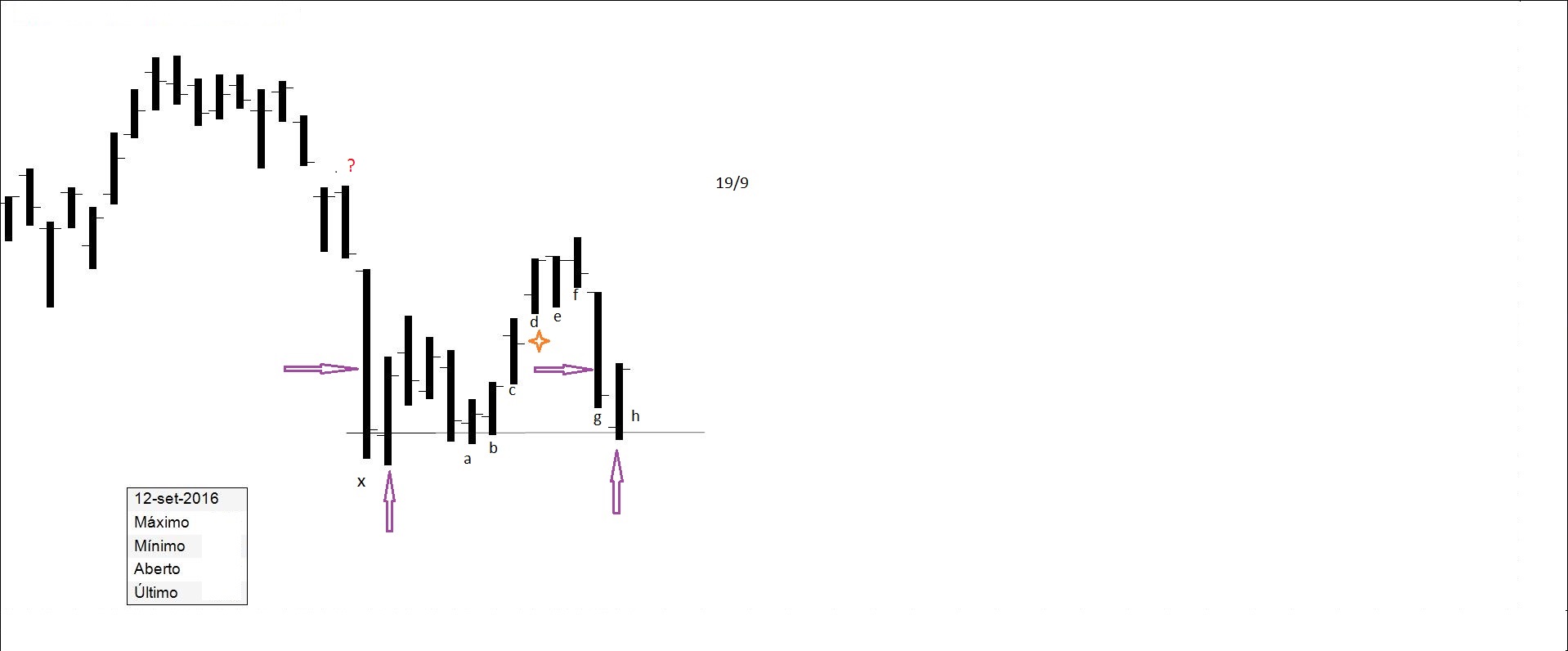 x - a - b - c - (gap) d - e - (-) f - (-) g - h - ... (o algoritmo diz que é para cima).