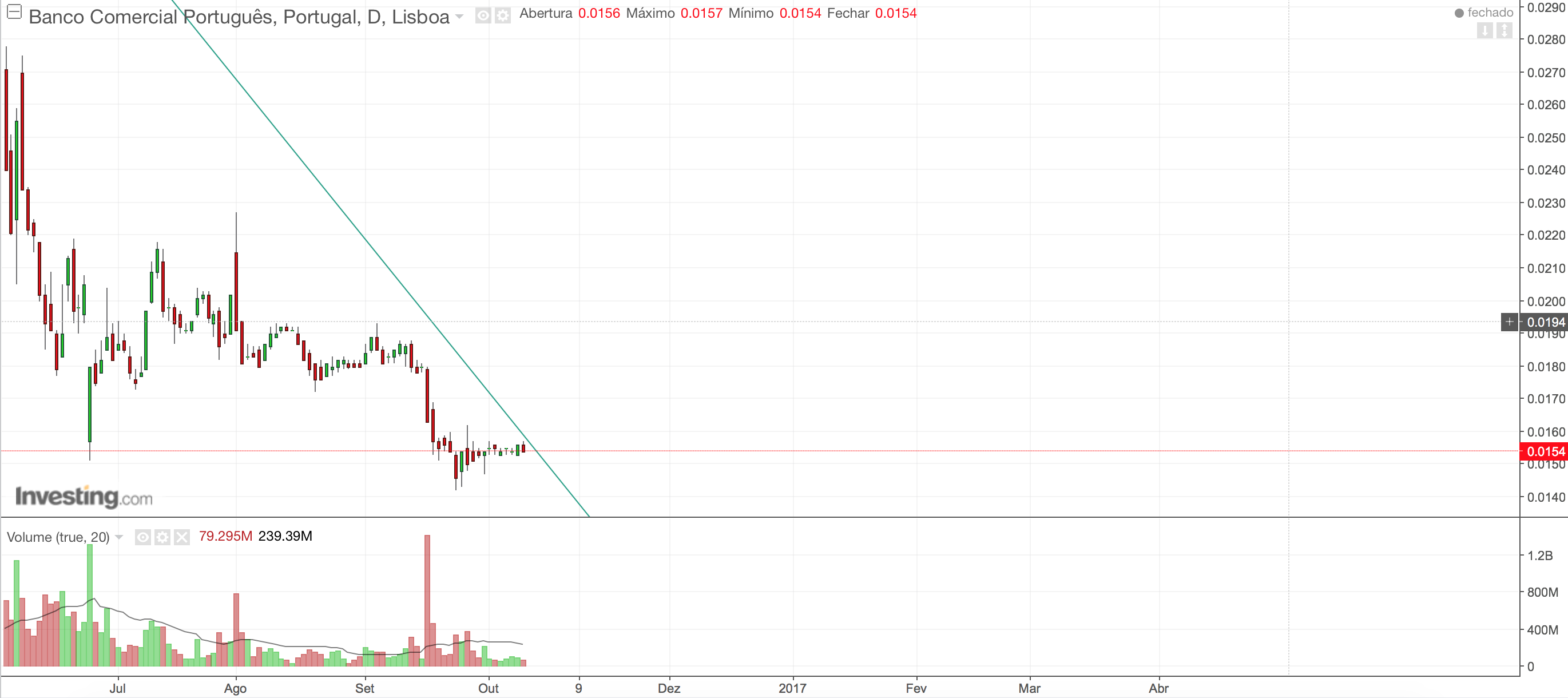 A zona em torno de 0,0180 euro é zona de resistência. Claro que, se a Fósun estiver disposta a subscrever um aumento de capital do BCP, ao preço de 2 cêntimos, ou perto disso, por ação, a cotação do BCP teria condições para vencer aquela resistência.