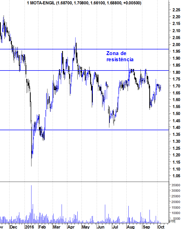 A Mota-Engil entrou hoje na sua zona de resistência. Dada a velocidade das últimas subidas, não acredito que a zona de resistência seja ultrapassada neste primeiro ataque. Seria interessante, algum tempo a marinar nesta zona para, daqui a uns tempos, o verdadeiro ataque a uma resistência que - caso seja quebrada - abre portas à acção.