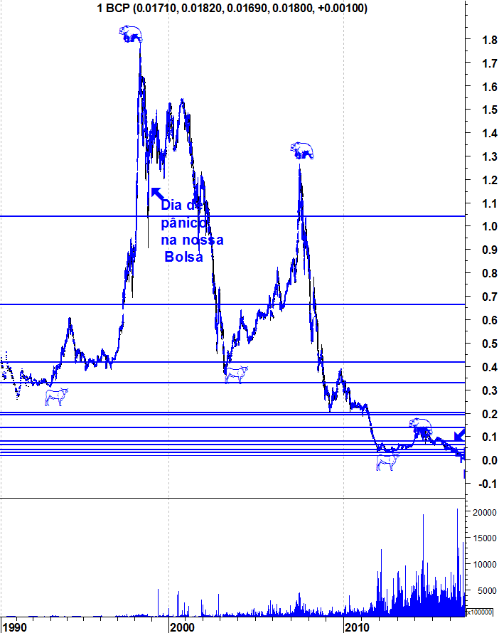 Para terminar, o BCP parou de cair desalmadamente e recuperou um pouco, mas está muito longe de estar "seguro", pelo menos eu não considero. Só digo que quem me dera a mim só estar a entrar agora ou ainda mais acima, depois de já ter perdido uma recuperação de +25% desde os mínimos, seria bem melhor que estar a 190% do preço médio! Ainda me lembro de um amigo que as tinhas desde os 0,09 e as vendeu a perder bem no primeiro dia de férias de manhã (sessão após resultados e apos anuncio da fosun))quando elas dispararam 10% e fecharam a cair bem, que me disse "estou farto, vou vender que tenho hipótese de as apanhar mais em baixo porque isto é um poço sem fundo", vendeu a 0,02x e ainda não entrou outra vez e todos os dias me diz que ainda podem subir x% que se lhe apetecer entrar entra mais barato que quando saiu! e ainda hoje me arrependo de não ter feito o mesmo (seja nos 0.02x, 0.03x ou qualquer outro valor!) mas achei que o fundo estava encontrado (por acaso não achei, rezei e saiu furado, n vezes... desde os 0.05).