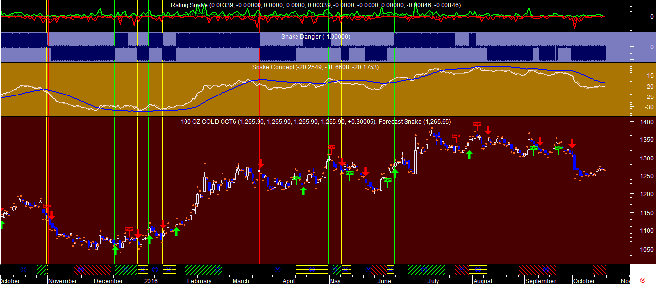 Em seguida deixo ficar também um gráfico diário do Ouro, o qual se encontra com posiçoes vendidas ou curtas. Este gráfico comprova, através dum sistema de trading diferente do anterior, uma tendência presentemente descendente: