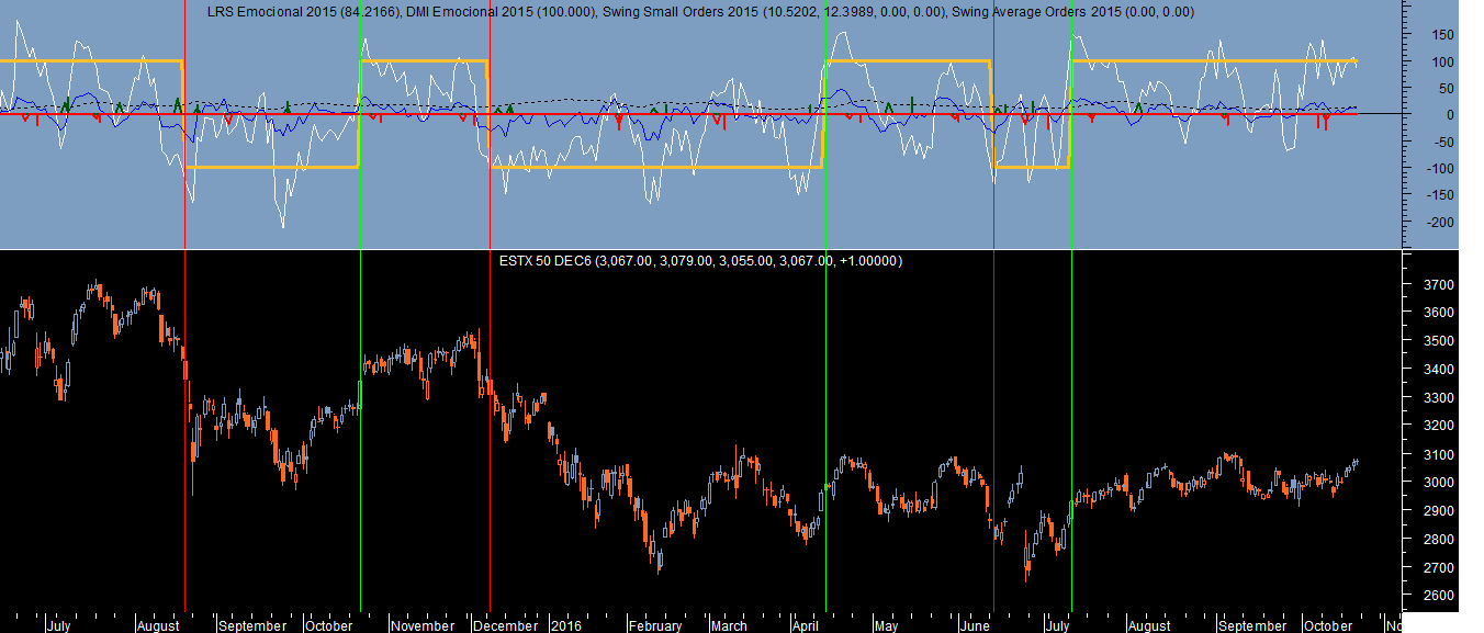 A seguir vem outro índice, o Euro Stoxx 50 com posiçoes compradas. Neste caso fica um gráfico diário com os sinais da tendência do respetivo sistema “Emocional 2015”, de novo a comprovar a grande dificuldade das tendências poderem ser detetadas com um razoável grau de fiabilidade devido ao comportamento quase errante e sem direçao definida do índice:
