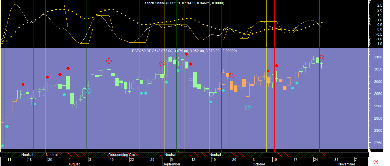 A razao incide em ambos os casos no termo do ciclo oscilatório ascendente de curto prazo, como se pode constatar no gráfico abaixo do Euro Stoxx 50.
