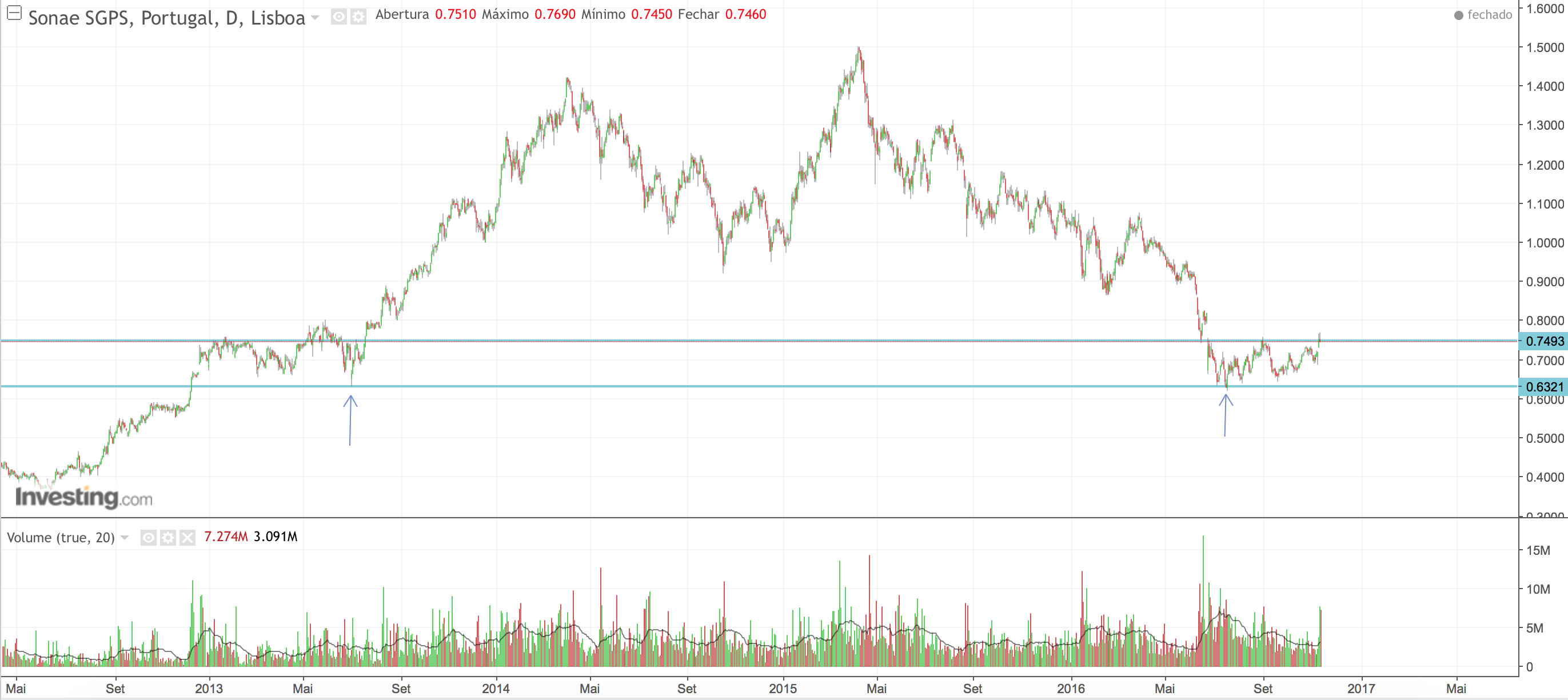 figurastecnicas Escreveu:A Sonae SGPS iniciou uma tendência descendente desde Abril de 2015, tendo já perdido metade do seu valor (ver gráfico abaixo). É, aliás, uma acção que acompanha fielmente os movimentos do PSI20. Tal como no início de 2013, altura em que a acção se encontrava em pleno Bull Market, na zona entre os 0,75 e os 0,63€ os preços têm tendência a lateralizar, antes de nos indicarem qual o caminho que vão seguir. Como é possível observar também, no início desta lateralização de 2016 os preços foram suportados a cerca de 0,63€, zona que serviu também de suporte em 2013.
