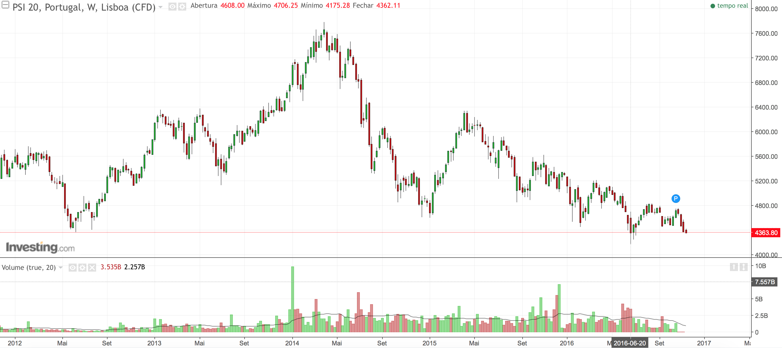 Se o PSI20 fechar abaixo de 4362 pontos esta semana será o fecho semanal mais baixo desde 1996.