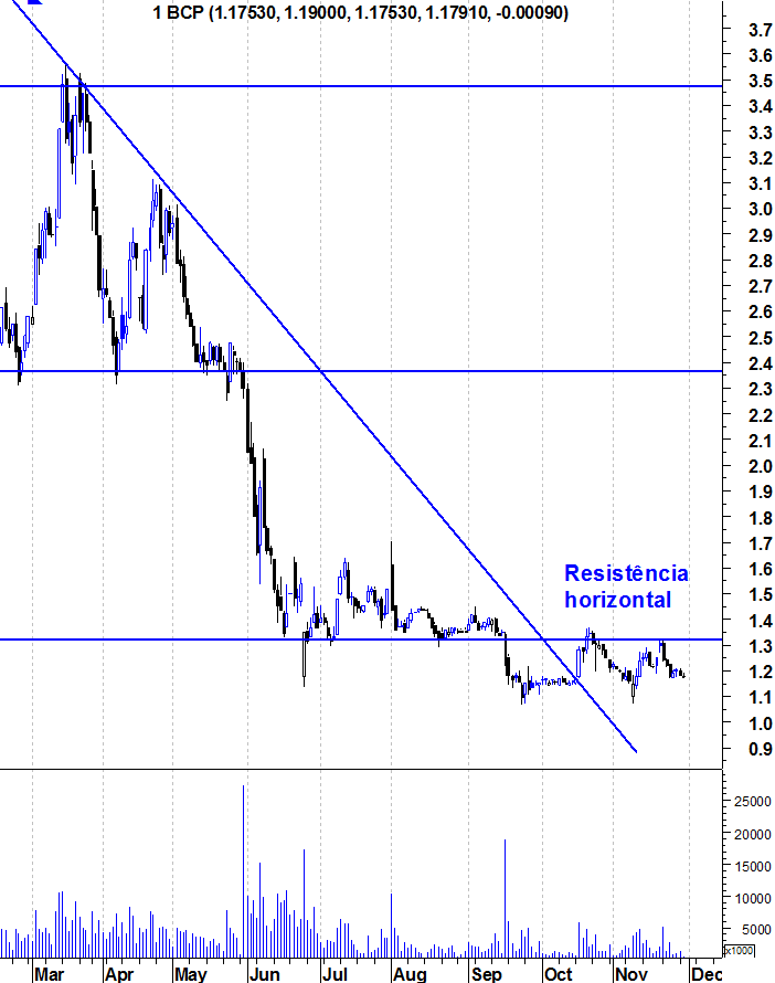 O BCP continua o seu calvário. Se ultrapassar a resistência entre 1,32 e 1,34 o potencial é enorme, mas enquanto isso não acontece o BCP continua sob domínio dos ursos. Um domínio intenso que faz com que a acção esteja quase em mínimos históricos. Para quê complicar? Esperar pelos sinais de força.