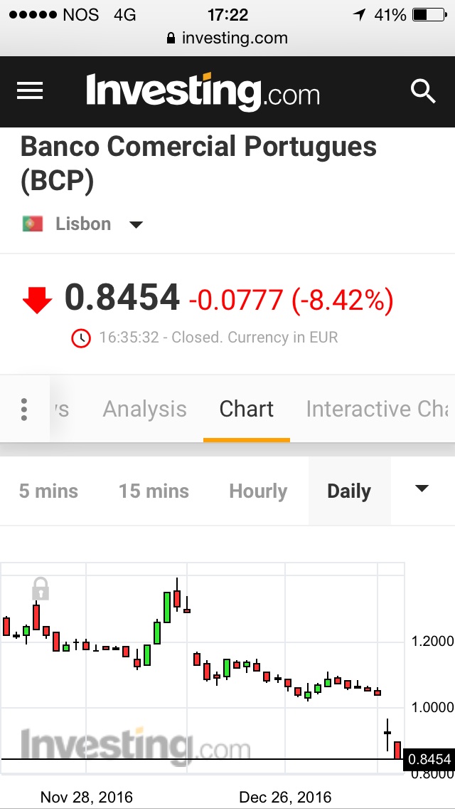 ativo Escreveu:Ontem, o BCP fechou a descer 11,34 %, hoje 8,42 %, em ambos os dias com grande volume de ações negociado. Hoje, percentualmente, desceu um pouco menos do que ontem, mas, ainda assim, foi, percentualmente, uma grande descida. Em dois dias desceu, quase 20 %, tendo hoje fixado novo mínimo histórico!!!