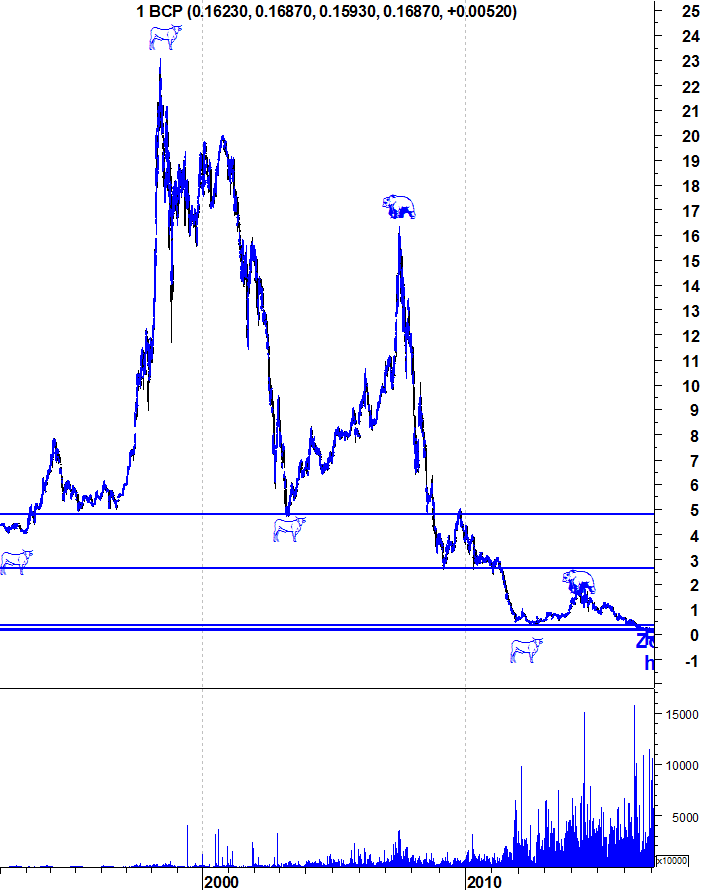 Deixo aqui os gráficos actualizados do BCP (Já devidamente corrigidos de todos os aumentos de capital e "splits"). A resistência de curto prazo situa-se entre os 0,18 e os 0,19 e a grande resistência da acção na zona dos 0,235.