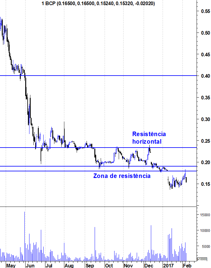 Tal como tenho vindo a dizer, não serão as notícias da economia portuguesa ou do Banco que me farão deixar de estar pessimista no BCP. Aquilo que me fará mudar de ideias é a força compradora e os sinais evidenciados no gráfico. Por isso, o primeiro grande sinal de curto prazo seria a quebra da resistência entre os 0,18 e 0,19. Muitos dizem que o BCP caiu hoje por isto ou por aquilo. A minha opinião já sabem qual é: Chocou de frente com a resistência.