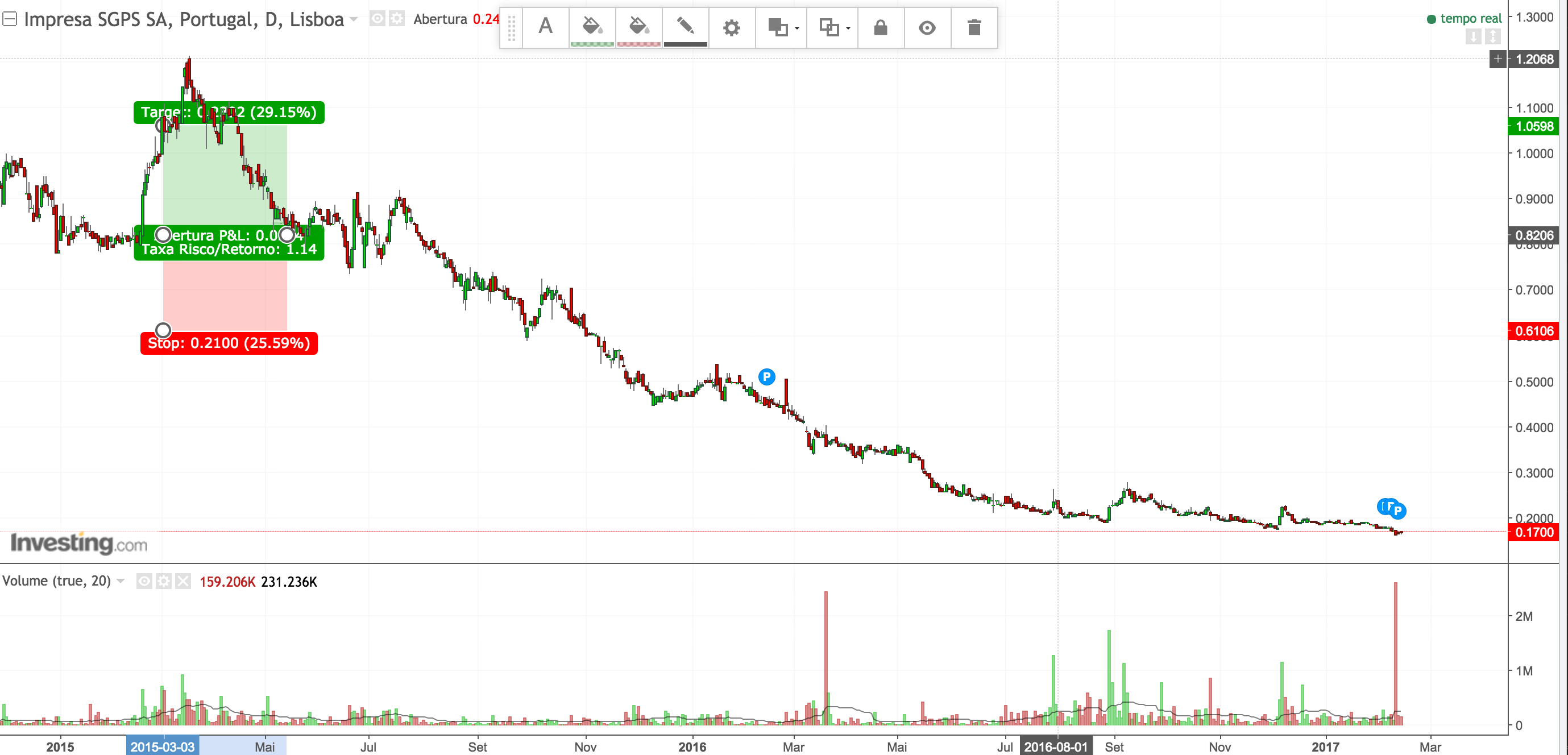 Pelo lado negativo, se for abaixo da linha a vermelho a operação é fechada, apesar de acreditar que será um fecho errado (pelo valor irrisório que o mercado atribui à impresa) mas é o que tenho definido.