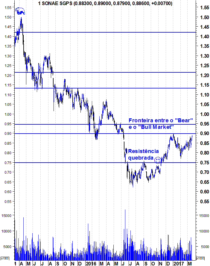 Deixo os gráficos actualizados da Sonae que já leva 8 meses de subida e que tem confirmado todos os bons sinais que deu quando quebrou a resistência dos 0,75 euros. Está próxima do seu grande desafio que é a zona da resistência entre os 0,9 e os 0,95 euros. Quando conseguir romper consistentemente esta zona, terá ultrapassado o último bastião dos ursos e os touros dominarão todos os horizontes temporais. Falta um último passo.