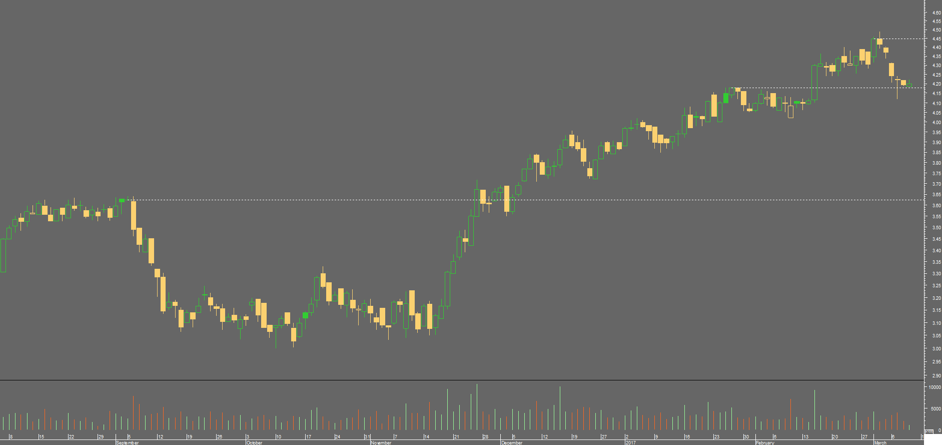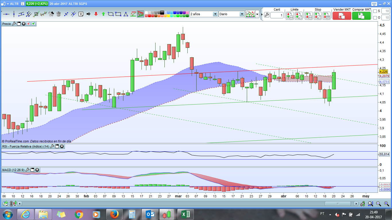 Penso que a primeira barreira está nos 4,26€. Eu entrei hoje nesta cotada com uma pequena quantidade de acções adquiridas a 4,207€.