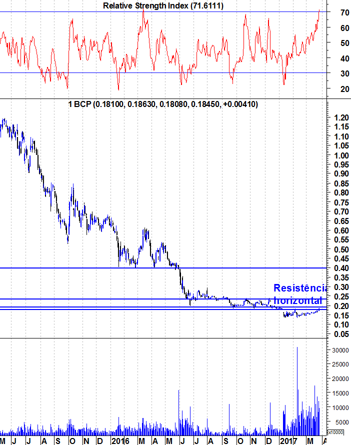 Ulisses Pereira Escreveu:Aqui ficam os gráficos actualizados do BCP. Chegou à zona de resistência entre 0,18 e 0,19 euros, está "sobrecomprado", tem tudo para uma correcção de curto prazo acontecer.