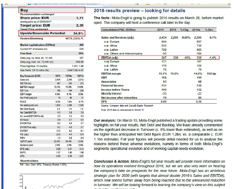 A Caixa BI previu um EBITDA de 330 m€ e a Mota apresentou 336 m€.