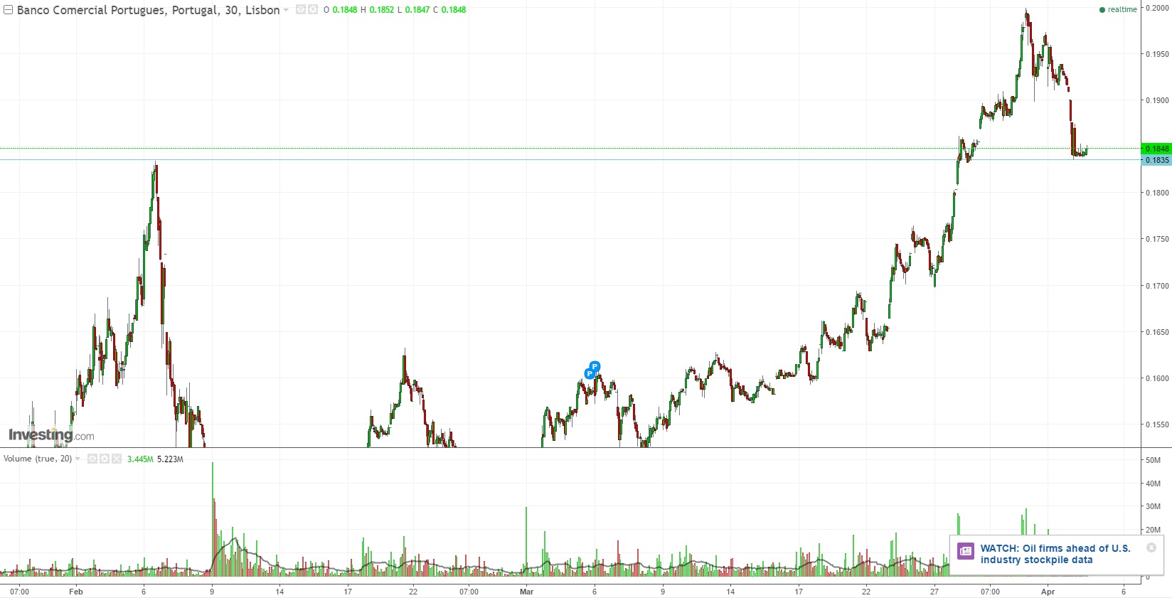 Movimento mais que esperado de correção no BCP. Proximos dias da semana serão decisivos, próxima etapa: casa dos 0,17-0,16, neste momento encontra-se a negociar em cima de suporte importante 0,18-0,19, se se aguentar, será bastante positiva a evolução para o ataque à casa dos 0,20-0,235.