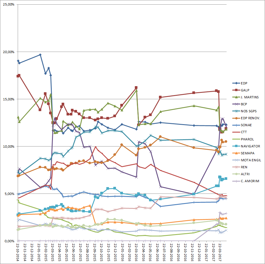 Aqui há uns meses (ou semanas?) prognosticavam (Schauble, Passos e outros adeptos do diabo) que a yeld nunca mais iria andar abaixo de 4%. Que agora é que ia ser, que vinha aí outro resgate bla bla. Aquele pico de queda no início de Abril é um sinal de tendência de desagravamento das yelds. Aliás há uns meses referi que os 4% eram uma forte barreira no ressalto que efectuou depois de atingir mínimo histórico. Creio que a tendência é de descida. O que é bom para as empresas. Provavelmente o trabalho da geringonça de baixar o défice, aumentar o PIB e levar o desemprego para mínimos que ninguém imaginaria, contribuiu para isto e já se fala em subida de rating. Quem diria a geringonça conseguir atingir esse objectivo.E o PSI agradece.