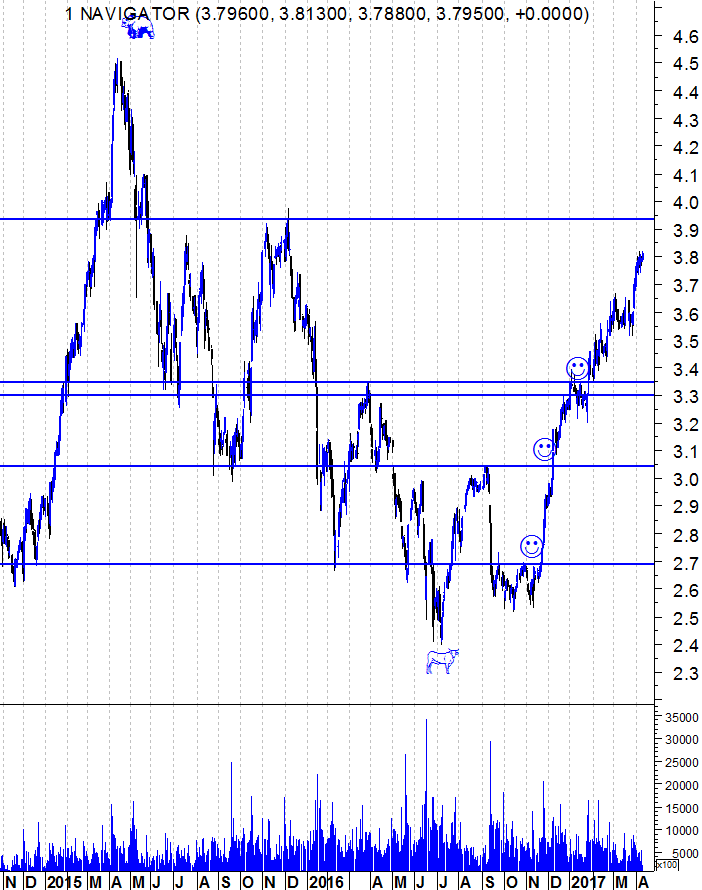 tradermoraisbravo Escreveu:Ulisses Pereira Escreveu:O que há a dizer de um gráfico destes? Um "Bull Market" limpinho como a água. No caso da Navigator, claramente a consolidar depois do arranque de final de Março.