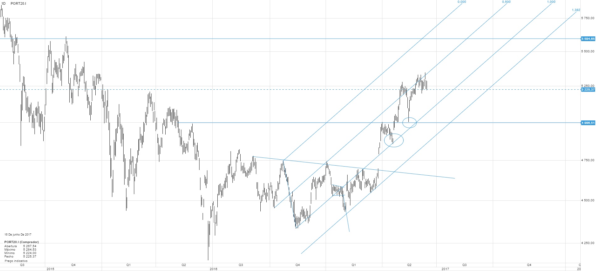 Abaixo fica a minha visão do bicho, procuro uma terceira bolinha para entrar, vamos ver em que linha aparece ela. O stop ainda está em estudo. Não usar nenhum ou coloca-lo abaixo do que poderá ser o fim do bull é uma opção caso me decida por um ETF, se for em CFD, terei mais cuidadinho por causa das coisas, abaixo de um mínimo relativo bem encarado.
