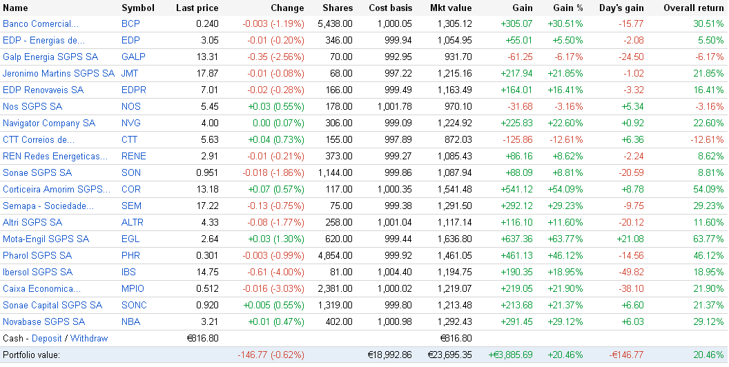 Tenho investido num fundo de acções de Portugal, que tirando algumas pequenas diferenças tem tendência a evoluir +/- ao ritmo do PSI20 (pelo menos pelo que tenho observado ao longo dos últimos anos).