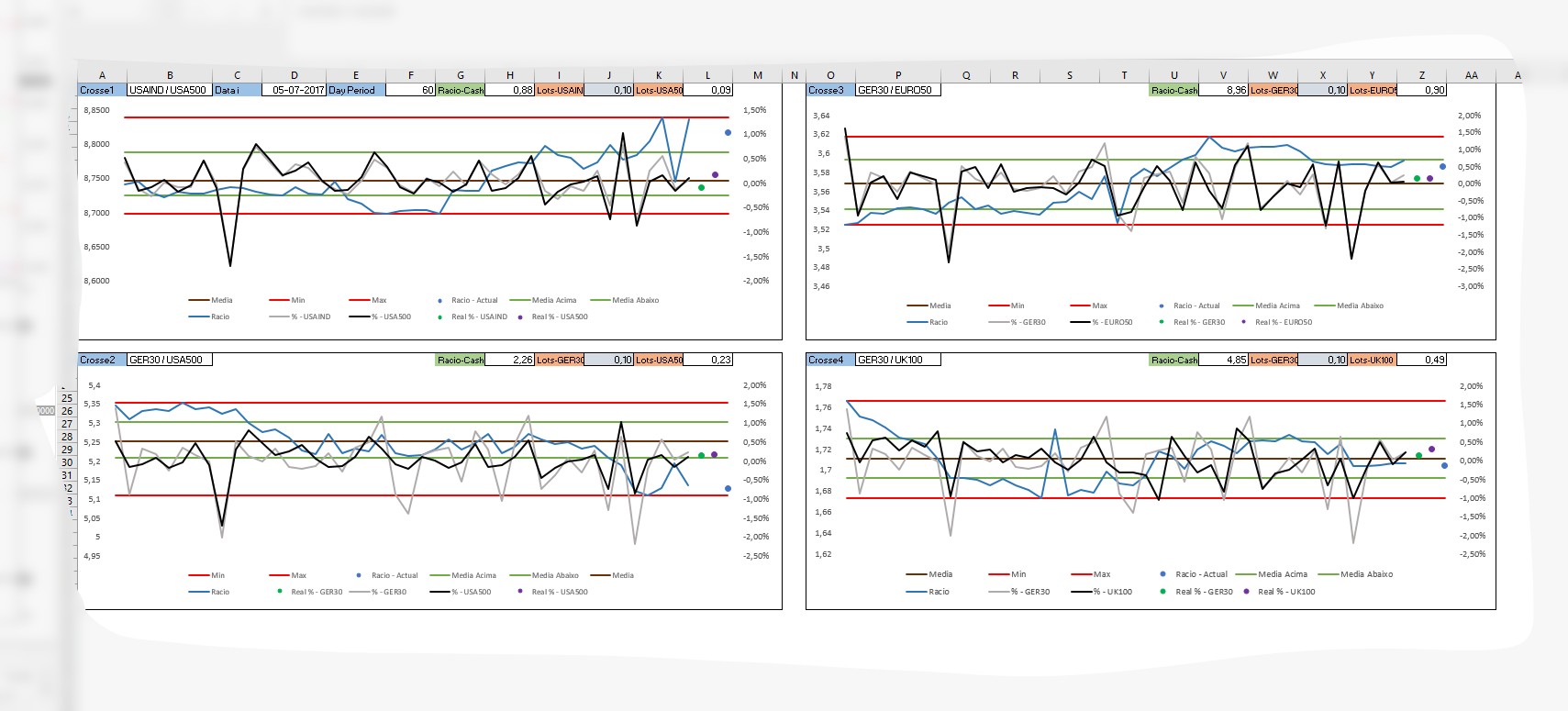 Em 2º lugar também no excel tenho o historial e os valores correctos just in time da correlação entre os activos que normalmente negoceio