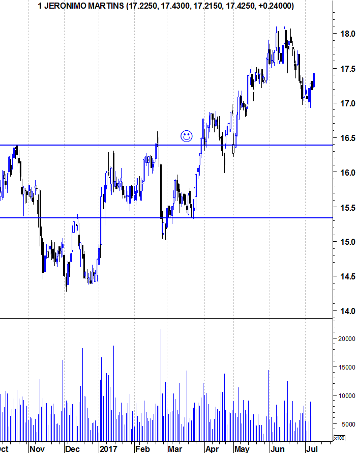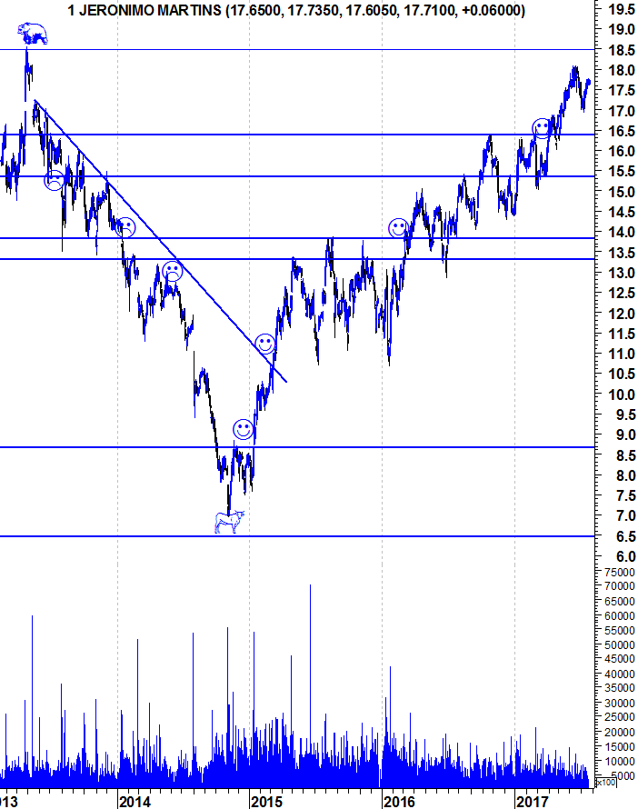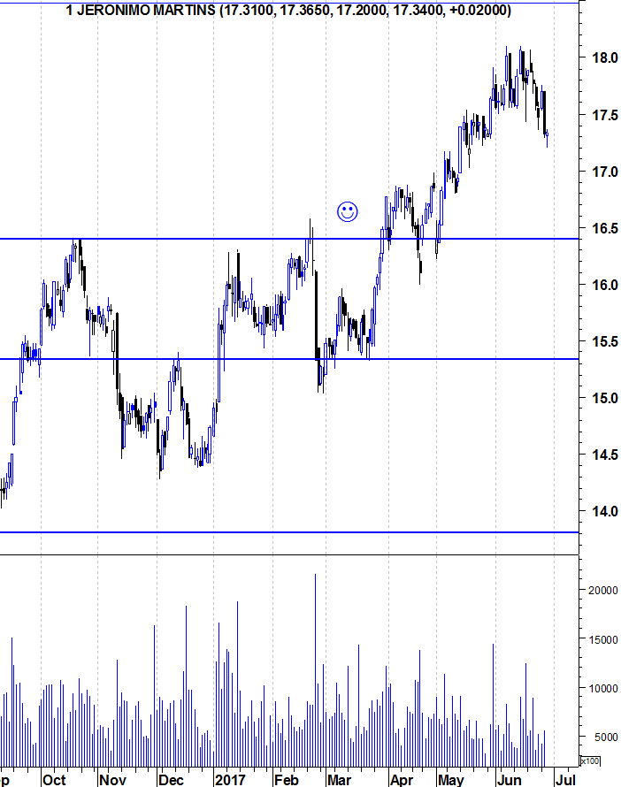 Apesar de a JMT apresentar um Bull Market indiscutível no gráfico e estar ainda perto de máximos , acredito que é possível assistirmos a uma correção saudável daqui até Outubro , para a zona dos 16 euros , onde eu equacionaria fazer uma entrada , de acordo com condições do mercado.