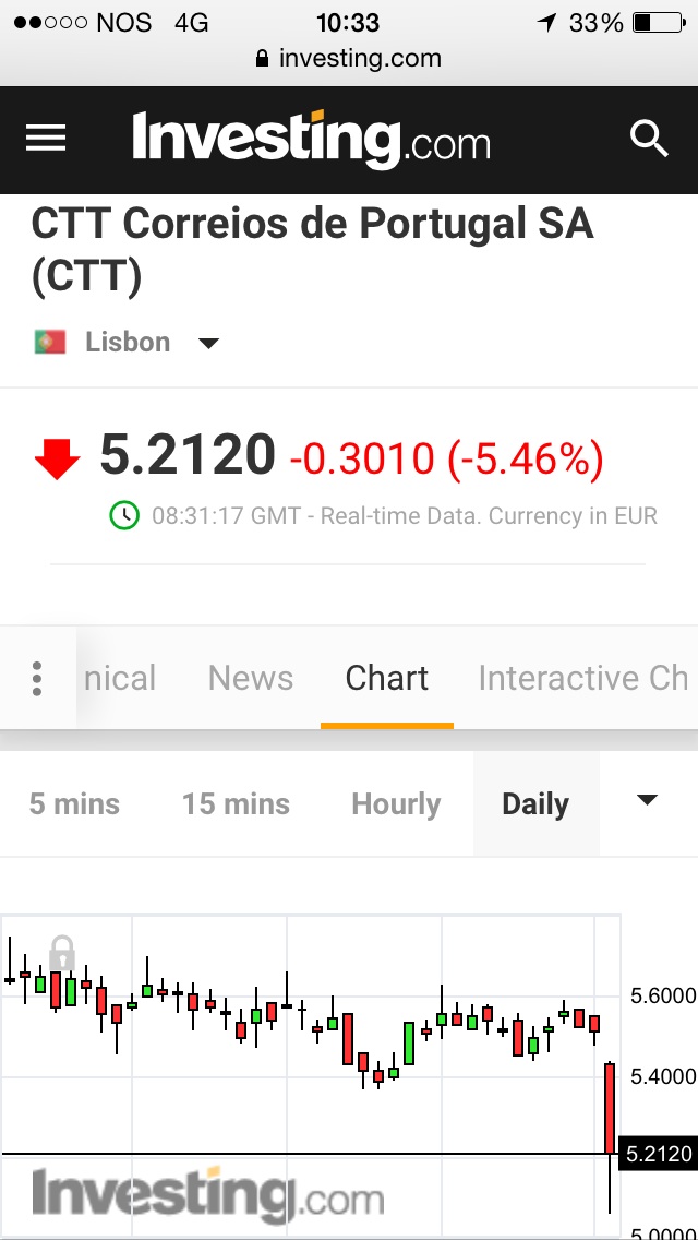 Dr Tretas Escreveu:Eu cá estou com o Romeno. Se vier abaixo de 4€ pode ser que olhe para os CTT. Até lá não me parece nada famoso, será que para o ano vão cortar os dividendos, ou vão, na prática, continuar a distribuir depósitos de clientes como dividendo :?: