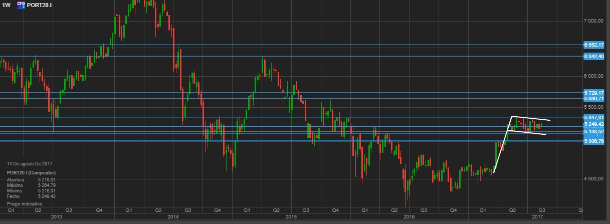 Desde o inicio de junho está a lateralizar entre os 5150 e os 5300 ao longo de 3 meses , até iniciar período descendente Setembro/ Outubro acompanhando internacionais.