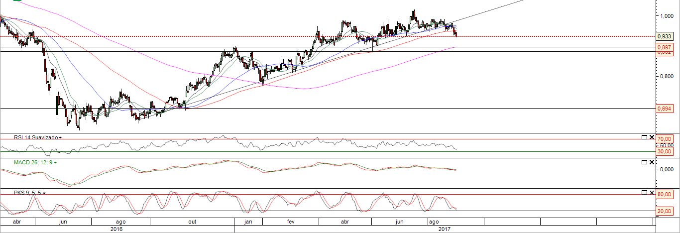 A cotação está a aguentar-se na casa dos 0,93, reagindo para norte quando atinge este valor. Veremos se é o suficiente para aguentar a cotada nestes valores ou se visitará em breve os 0,90€.
