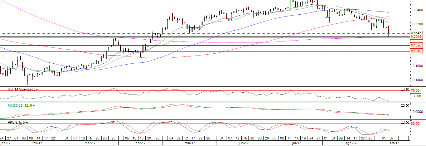 Vamos ver como se comporta agora nos 0,206 onde bate na LTD de curto prazo. Um duplo fundo não ficava mal nos 0,202 ou um pouco abaixo