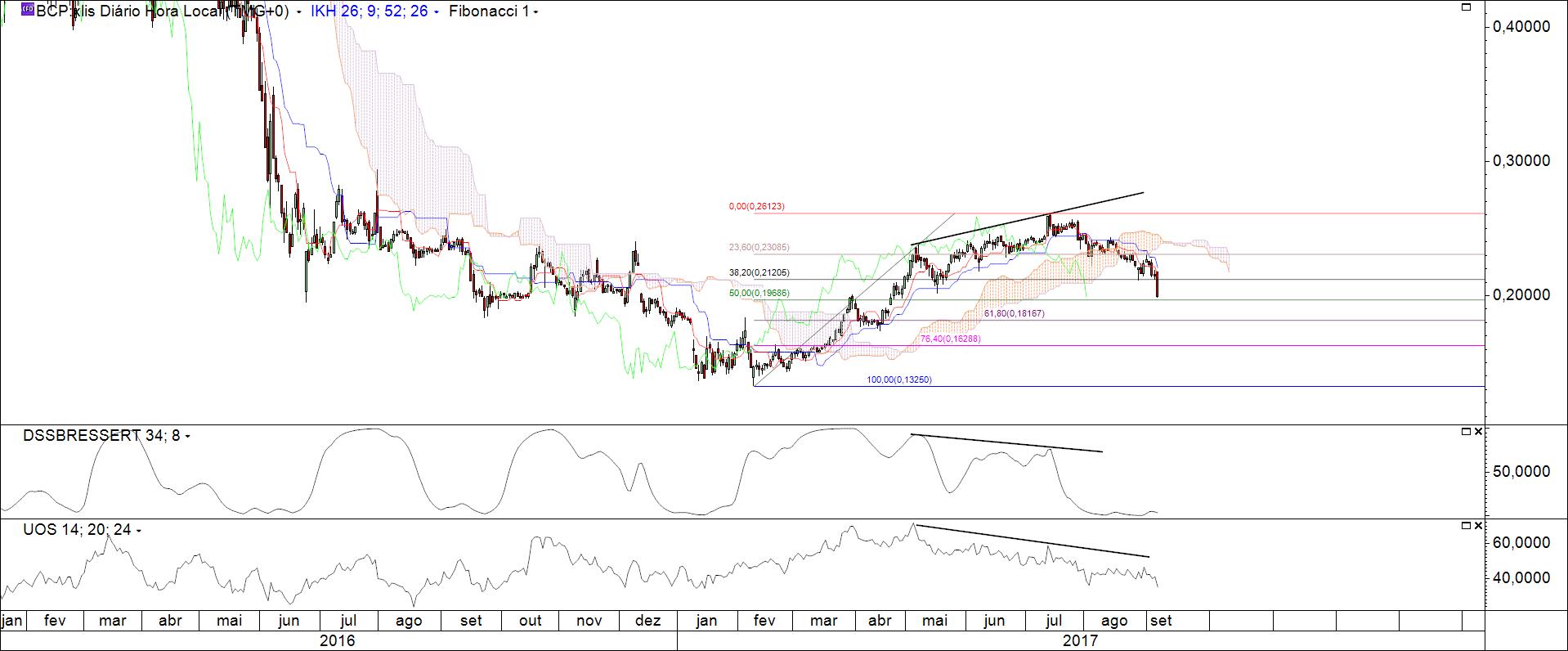 Hoje o BCP está com um volume de respeito, infelizmente é em queda forte o que pode não augurar uma boa tendência para curto/medio prazo.