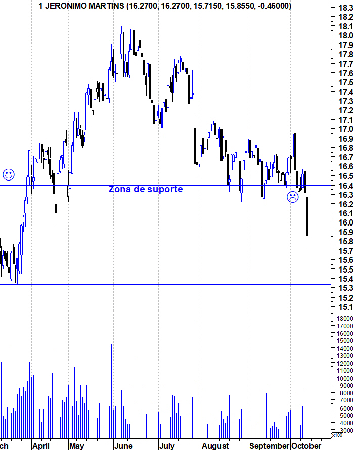 A acção dá o primeiro grande sinal de fraqueza e, por isso, estive Bullish desde a zona dos 11 euros, em Março de 2015 e com este primeiro grande sinal de fraqueza, dispo o meu fato de touro. Como bem referes, sou incapaz de dizer que a JM está bearish, mas é a hora de deixar de estar bullish no Bull Market mais antigo da Bolsa portuguesa.