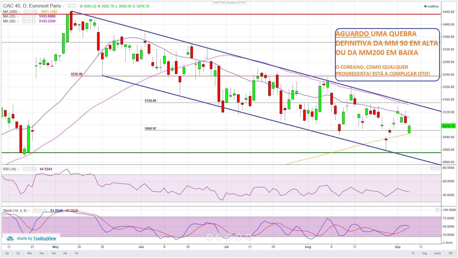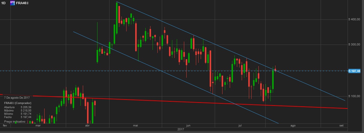Á semelhança do DAX outro índice na europa cuja tendência e canal descendente são claros e vincados, bem como a evolução da Mm50 .