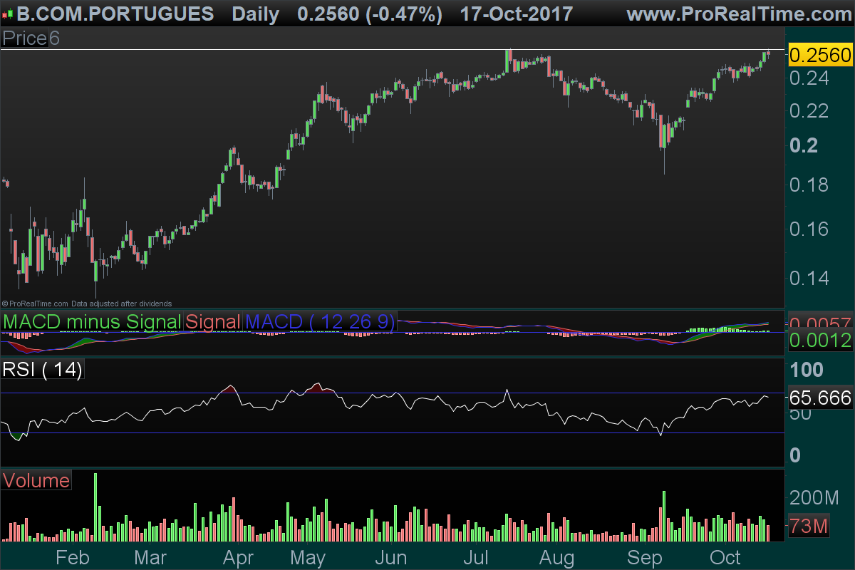 -MACD não desilude e tem-se aguentado desde meados de Setembro, não existindo cruzamento entre a linha MACD e de sinal. Houve apenas quase um toque na semana passada, mas manteve-se firme e continua com "bom aspecto";